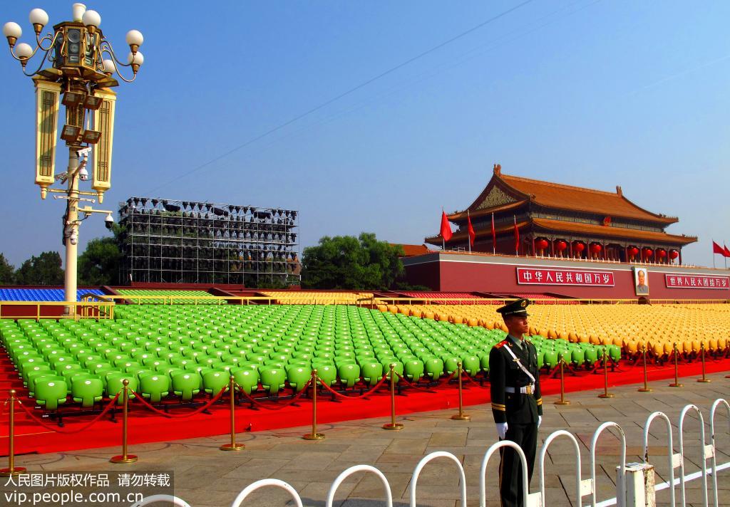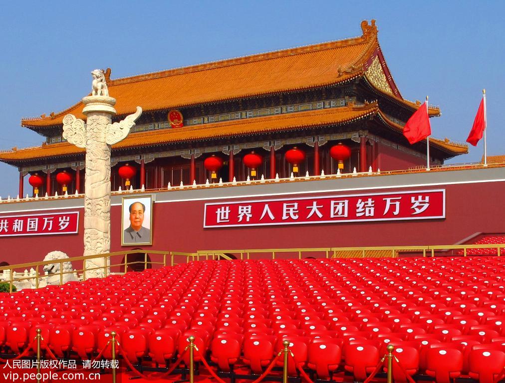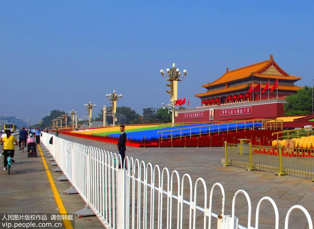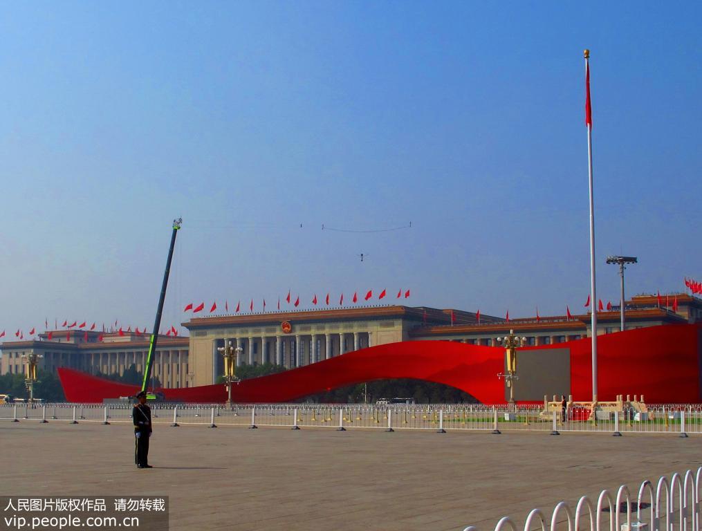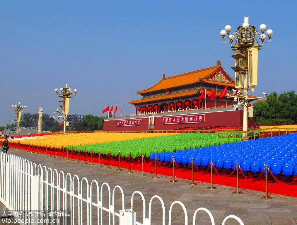 2019年9月29日,天安門廣場(chǎng)呈現(xiàn)壯觀美麗的景致,在天安門前臨時(shí)觀禮臺(tái)絢麗多彩,天安門城樓上掛上大紅燈籠、金水橋上鋪上了紅色地毯與廣場(chǎng)上紅色飄帶造型相互輝映,天安門廣場(chǎng)正以壯麗的景致迎接慶典的到來。(徐經(jīng)來/人民圖片)