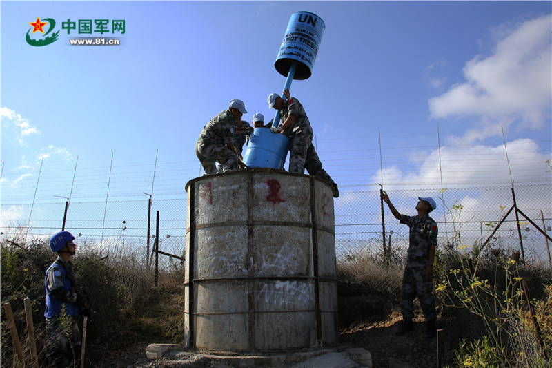 維和工人在施工,官兵說,這個(gè)藍(lán)桶相當(dāng)于國家與國家之間的分界線,也就是一般意義上說的——?;鹁€(圖/馬騫)