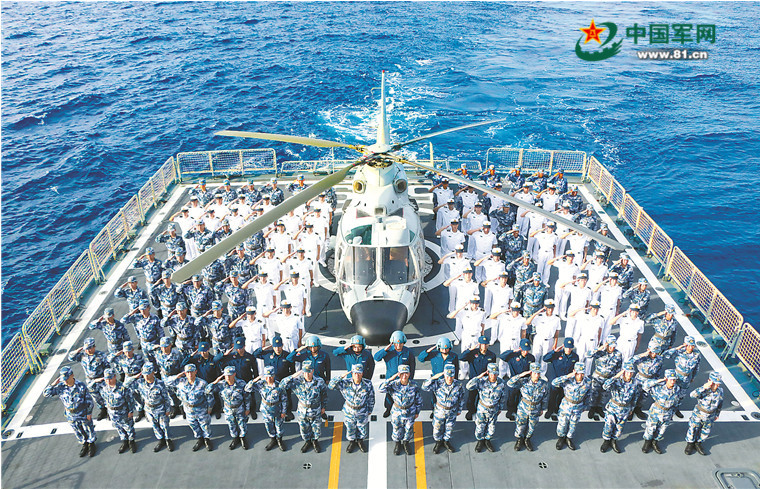 10月1日,執(zhí)行戰(zhàn)備巡邏任務(wù)的海軍玉林艦官兵在飛行甲板上擺出“70”造型,在戰(zhàn)位上為祖國慶祝生日。