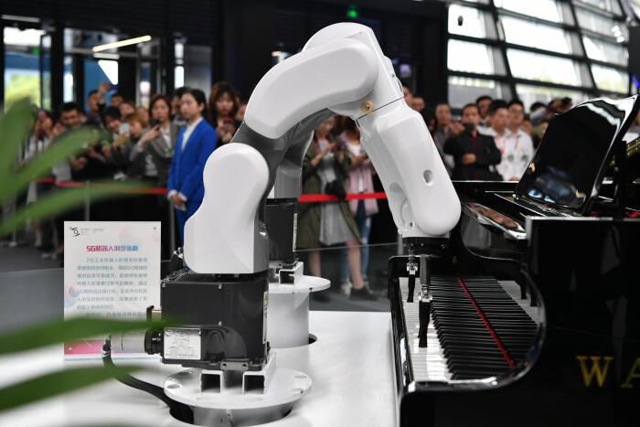 開(kāi)幕式現(xiàn)場(chǎng),機(jī)器人在用鋼琴?gòu)椬唷盾岳蚧ā贰z影/新京報(bào)記者 吳江