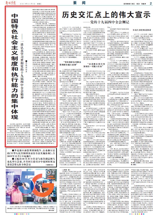 黨的十九屆四中全會,審議通過了《中共中央關(guān)于堅持和完善中國特色社會主義制度、推進國家治理體系和治理能力現(xiàn)代化若干重大問題的決定》,習主席發(fā)表重要講話?!稕Q定》明確了堅持和完善中國特色社會主義制度、推進國家治理體系和治理能力現(xiàn)代化的總體目標、重大任務(wù),作出了一系列關(guān)于我國國家制度和國家治理體系的新論斷、新部署,充分體現(xiàn)了以習近平同志為核心的黨中央高瞻遠矚的戰(zhàn)略眼光和強烈的歷史擔當,充分反映了新時代黨和國家事業(yè)發(fā)展的新要求和人民群眾的新期待,對于堅定“四個自信”,戰(zhàn)勝各種風險挑戰(zhàn),確保黨和國家興旺發(fā)達、長治久安,具有重大現(xiàn)實意義和深遠歷史意義。請關(guān)注今日出版的《解放軍報》的詳細報道——
