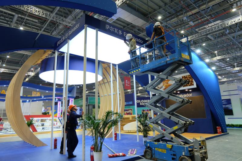 隨著布展工作進(jìn)入收尾階段,國(guó)家館的多數(shù)展臺(tái)主體結(jié)構(gòu)已搭建完畢,正在完成氛圍布置工作。