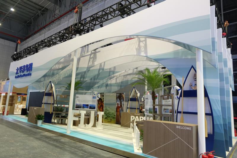 馬爾代夫展臺就像是一個(gè)坐擁私人海灘的度假村;厄瓜多爾也把“海鷗”和“椰林”帶到了展館;斐濟(jì)、瓦努阿圖、巴布亞新幾內(nèi)亞聯(lián)合展臺——太平洋島國展臺更是一展海島風(fēng)情,以藍(lán)色海洋為設(shè)計(jì)靈感,寓意著“21世紀(jì)海上絲綢之路”。揚(yáng)起的風(fēng)帆與海水的浪涌相結(jié)合,代表了開放的海洋文明與東西方文化的融合,展館內(nèi)部則對各島嶼的不同文化進(jìn)行了多樣性的展現(xiàn)。