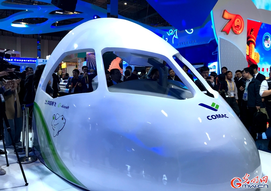 在中國館主入口左側(cè),中國商飛的未來電氣化飛機(jī)虛擬集成平臺尤為引人注目。不僅在展示板上,C919、CR929、ARJ21等國產(chǎn)飛機(jī)共同演繹“闊步新時(shí)代、共襄藍(lán)天夢”,現(xiàn)場還把C919的飛機(jī)頭“搬”到了展館,不少參觀者在操作臺上互動體驗(yàn)。