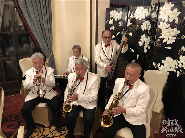 △晚宴現(xiàn)場(chǎng)的五位銀發(fā)樂(lè)手,是和平飯店的第二代爵士樂(lè)手,大多從上世紀(jì)七十年代末開(kāi)始在此工作。(央視記者馬亞陽(yáng)拍攝)