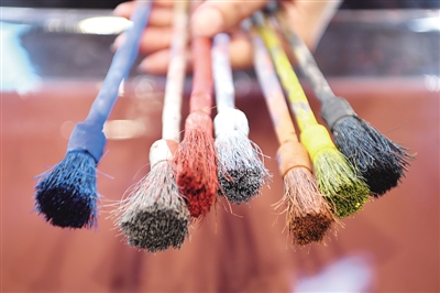 土耳其國家館展出的創(chuàng)作水拓畫使用的馬鬃毛筆。新華社發(fā)
