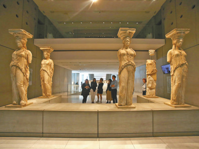 他們走到二層的少女廊柱前,仰望凝視。少女廊柱原本屬于衛(wèi)城的伊瑞克提翁神廟。經(jīng)歷兩千多年歲月滌蕩,眼前的雕塑依然紋路精美、線條富有動感。令人遺憾的是,一組6個少女廊柱并不完整,其中一個因遭受掠奪而流落海外。