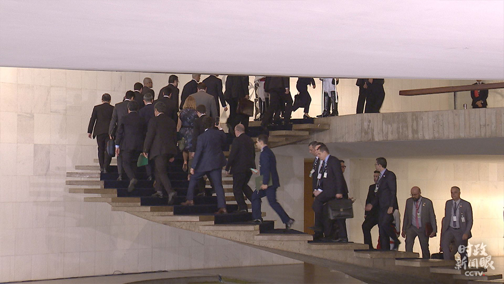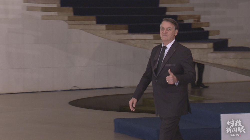13日上午,博索納羅來到巴西外交部一層大廳迎接習(xí)主席時(shí),向記者席豎起大拇指。習(xí)主席在會(huì)談時(shí)對(duì)博索納羅說:我們看好巴西發(fā)展前景,對(duì)中巴合作充滿信心。(央視記者張曉鵬拍攝)