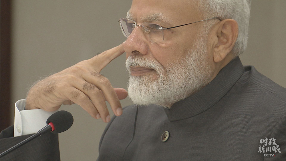 與習(xí)主席會(huì)談時(shí)的莫迪。習(xí)近平對(duì)他說:我同你在金奈成功舉行會(huì)晤,談得很好。我歡迎你明年到中國再次會(huì)晤。(央視記者荊偉拍攝)