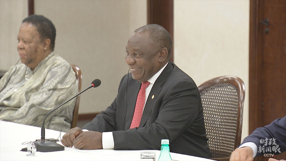 會(huì)談開始時(shí)的拉馬福薩。習(xí)主席對(duì)他說,中南對(duì)內(nèi)面臨發(fā)展經(jīng)濟(jì)的重任,對(duì)外都堅(jiān)定維護(hù)多邊主義,要鞏固“同志加兄弟”的特殊友誼和高度互信。(央視記者馬亞陽拍攝)