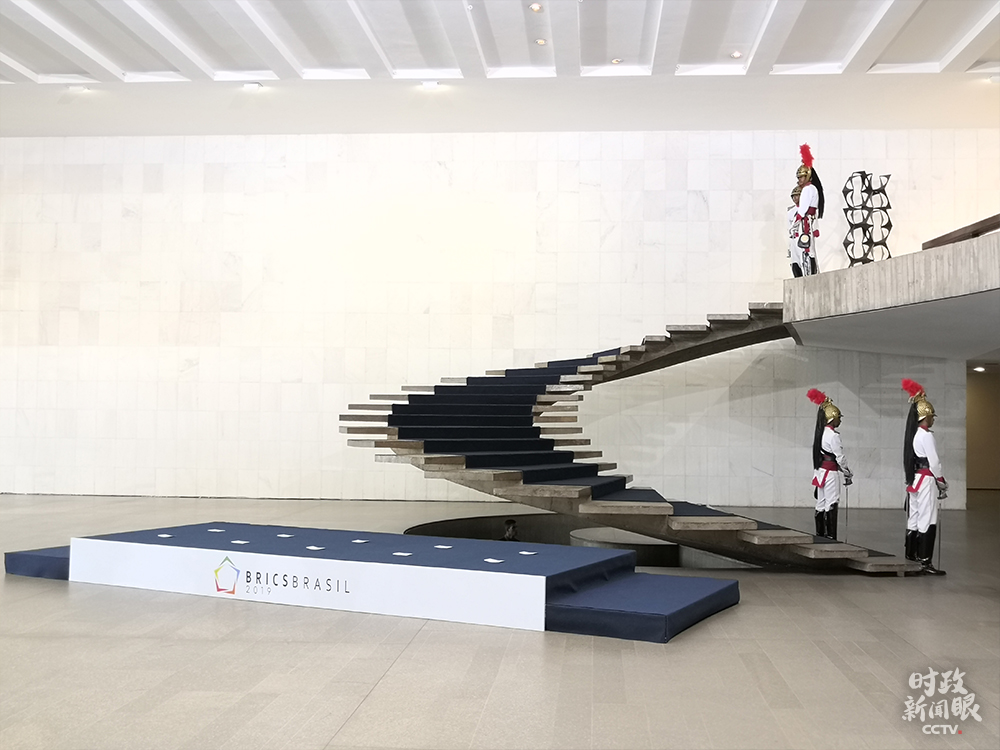 14日上午,以這個(gè)樓梯為背景,五國領(lǐng)導(dǎo)人集體合影。(央視記者薛冠南拍攝)