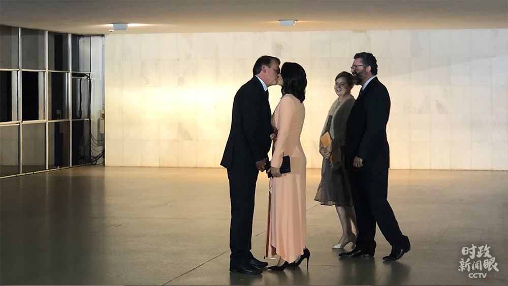 當(dāng)?shù)貢r(shí)間13日晚,博索納羅總統(tǒng)夫婦在外交部一層迎候各國元首夫婦時(shí),上演“巴西式浪漫”。(央視記者馬亞陽拍攝)