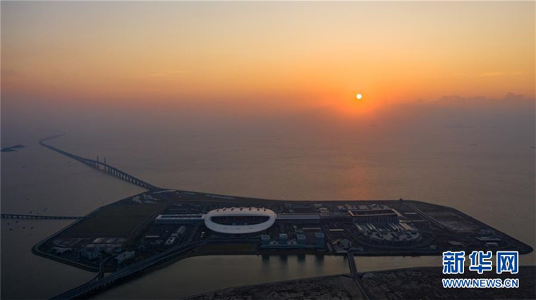 港珠澳大橋珠澳口岸人工島的日出(10月22日無人機(jī)拍攝)。 新華社記者 張金加 攝