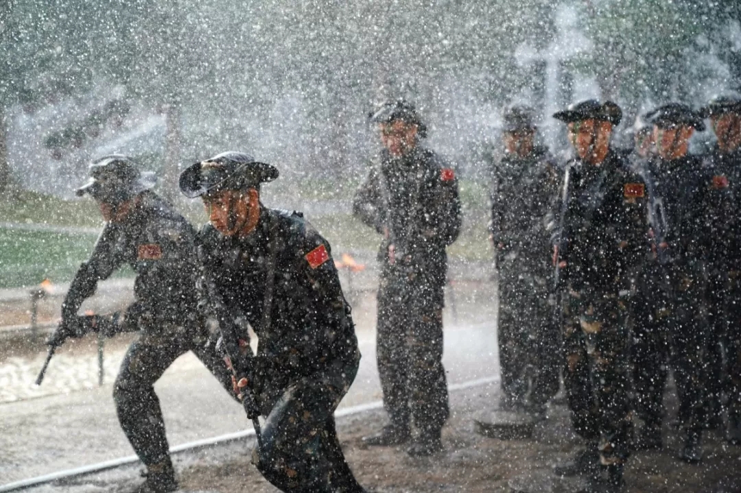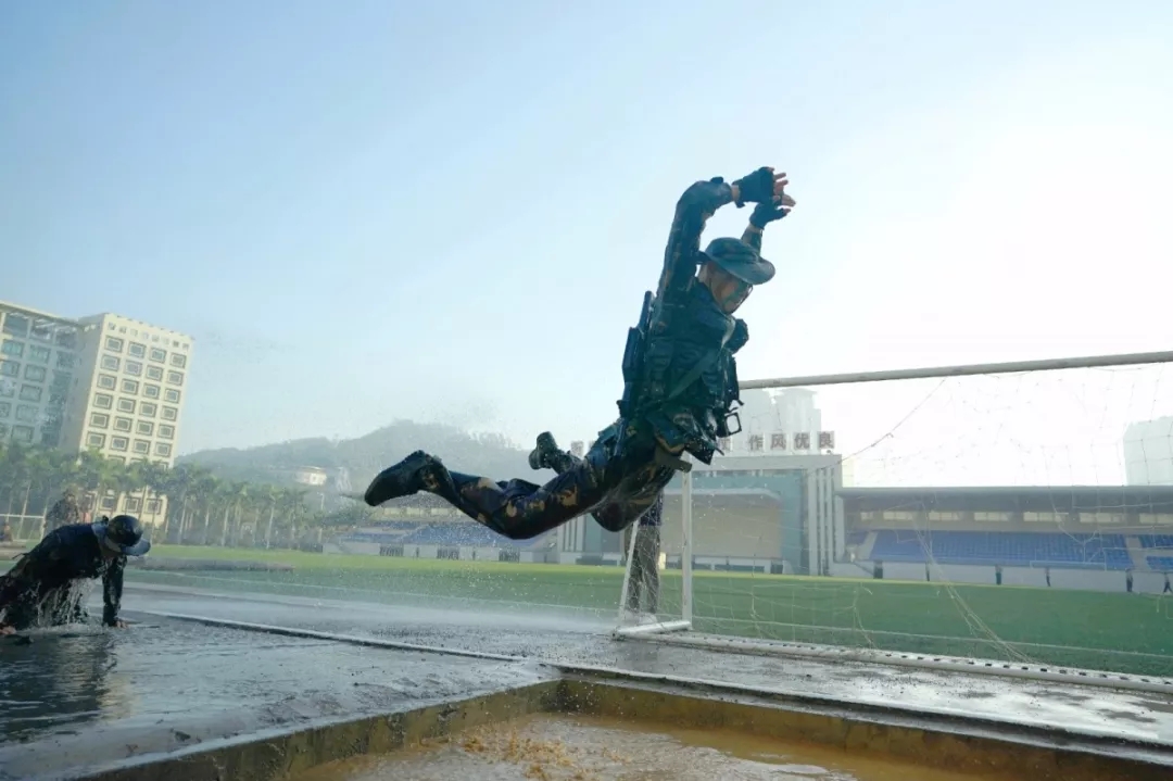 △官兵在雨中進(jìn)行意志障礙訓(xùn)練