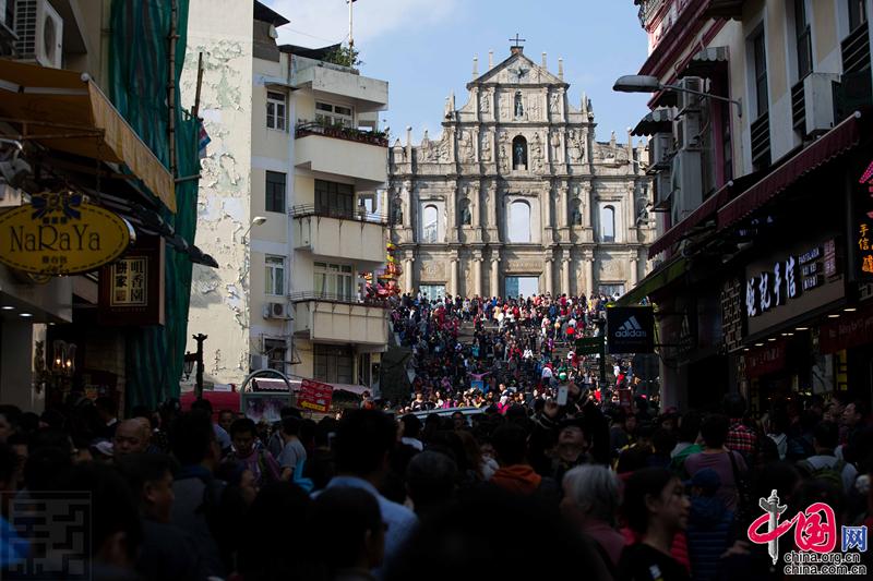 大三巴牌坊前,游客絡(luò)繹不絕。張金加 攝