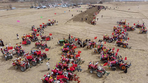 當(dāng)日,西藏各地男女老幼身著節(jié)日盛裝,駕著一輛輛由彩旗、花朵裝扮一新的拖拉機,涌向待墾的農(nóng)田,載歌載舞迎來一年一度的開耕儀式。春耕