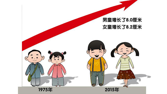 從1975年到2015年,我國兒童身高、體重指標均持續(xù)快速增長。以最具代表性的5到5.5歲年齡組為例,男童和女童身高分別增長了8.0厘米和8.2厘米。身高