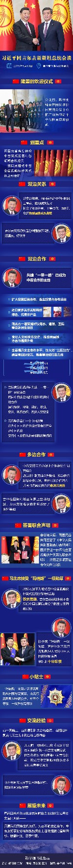 習(xí)近平表示,熱恩別科夫總統(tǒng)授予我“瑪納斯”一級(jí)勛章,充分體現(xiàn)了吉爾吉斯斯坦人民對(duì)中國(guó)人民的深厚情誼,我對(duì)此十分珍視。政治