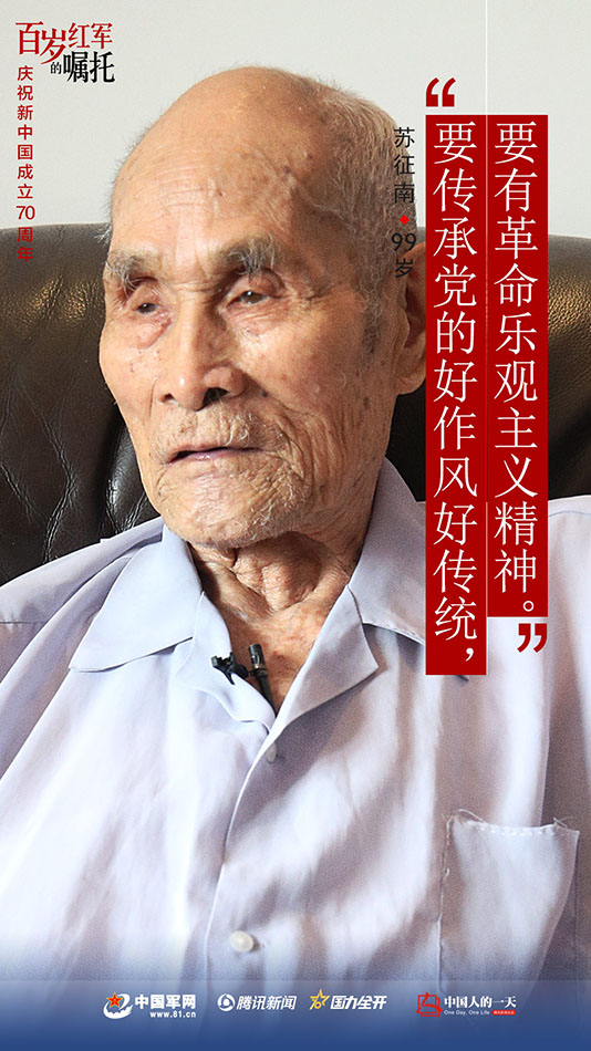 “要傳承黨的好作風好傳統(tǒng),要有革命樂觀主義精神?,F(xiàn)在過得是好日子,中國人要愛中國,保衛(wèi)中國,人人有責!”——蘇征南·99歲