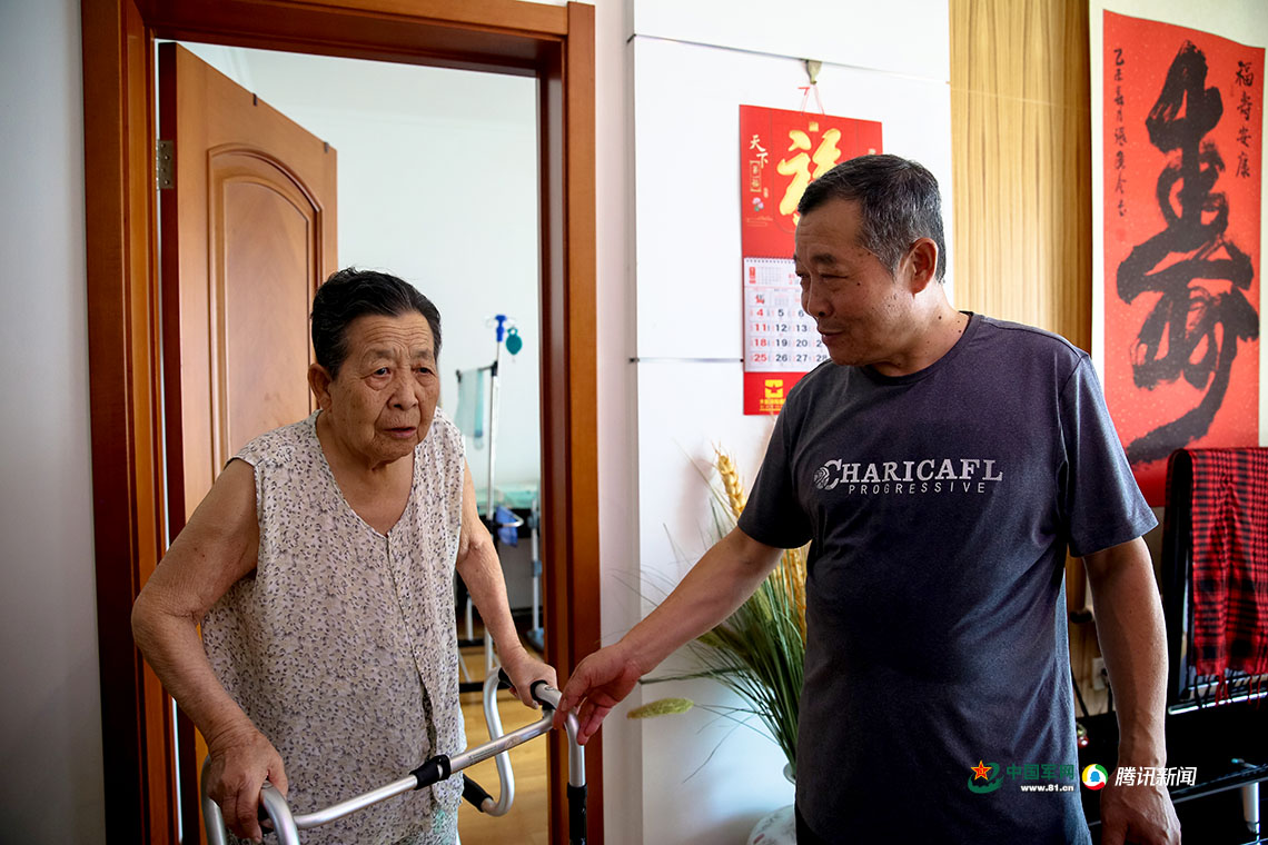 我們快結(jié)束采訪時,蘇征南的三兒子殷幸福準備攙扶著蘇征南去臥室休息,客廳另一個房間的門打開了,走出一位拄著助行器的老人,步伐緩慢有些吃力,在房間門口站定后,小聲地說:“該去休息了,不能讓他老坐著。”