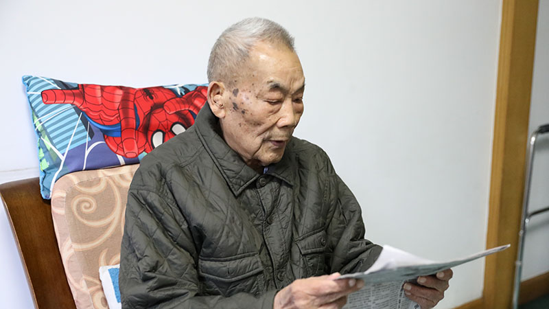 南京,東部戰(zhàn)區(qū)總醫(yī)院高干病房5樓,103歲的王楓老人在靜靜地等待著。兒子王成宇在一旁陪同,時刻關(guān)注著父親的需求。