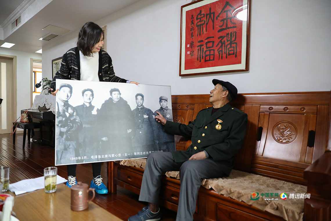 索心忠和記者講述合影的故事。圖上的老照片是1949年3月,毛澤東與索心忠(右一)等同志在北平西苑機場合影。中國軍網(wǎng)記者 伍行健 攝