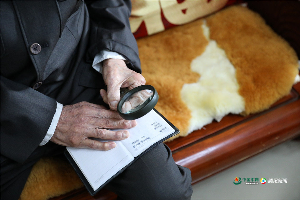姜福義讓記者在本子上寫下名字,用放大鏡辨認(rèn)。中國軍網(wǎng)記者 伍行健 攝