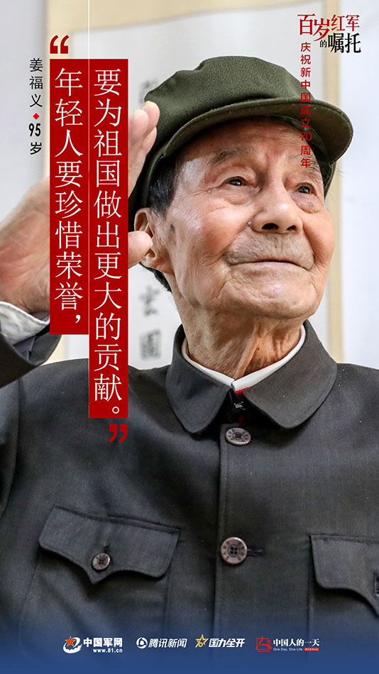 95歲的姜福義的囑托:“年輕人要珍惜自己的榮譽(yù),要為祖國做出更大的貢獻(xiàn),要有理想,忠于黨,忠于祖國,忠于人民,保持榮譽(yù)不變色。”