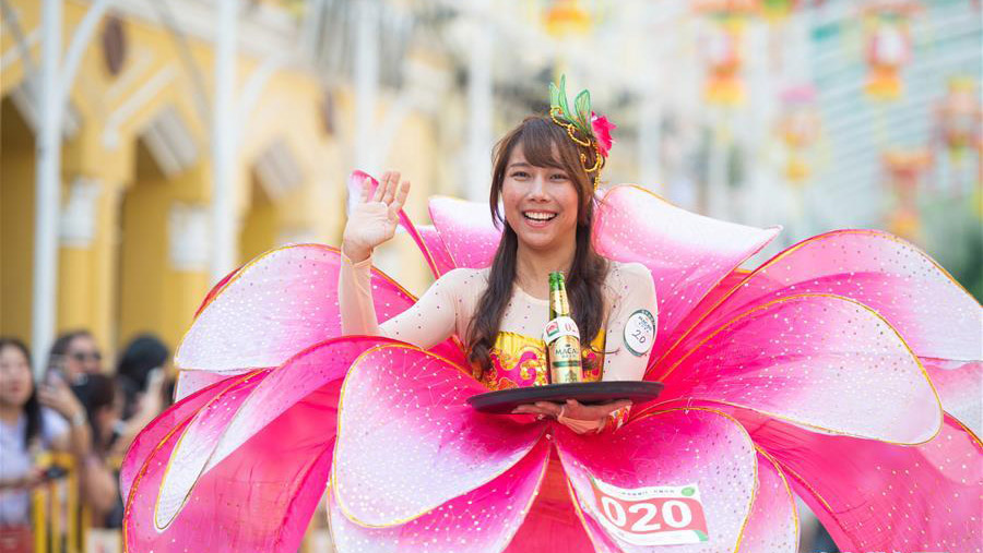 當日,澳門旅游局舉行傳統(tǒng)托盤比賽慶祝世界旅游日,參賽者需單手托起有啤酒的托盤,從大三巴走到議事亭前地。