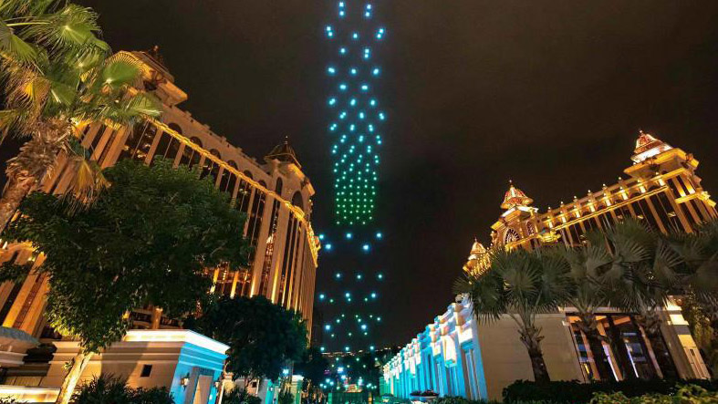 11月29日晚,澳門銀河娛樂集團在天浪淘園舉辦“翱翔星空表演”,安排 300 架無人機編隊表演,透過雷射、燈光及音效等技術,排列出一系列祝賀澳門回歸與運動元素的特色圖案,在夜空中帶來精彩閃耀的演出。