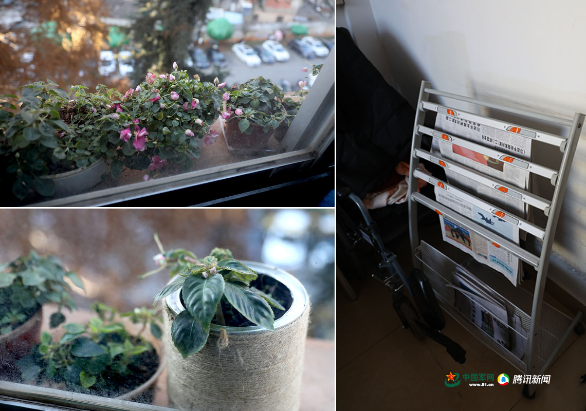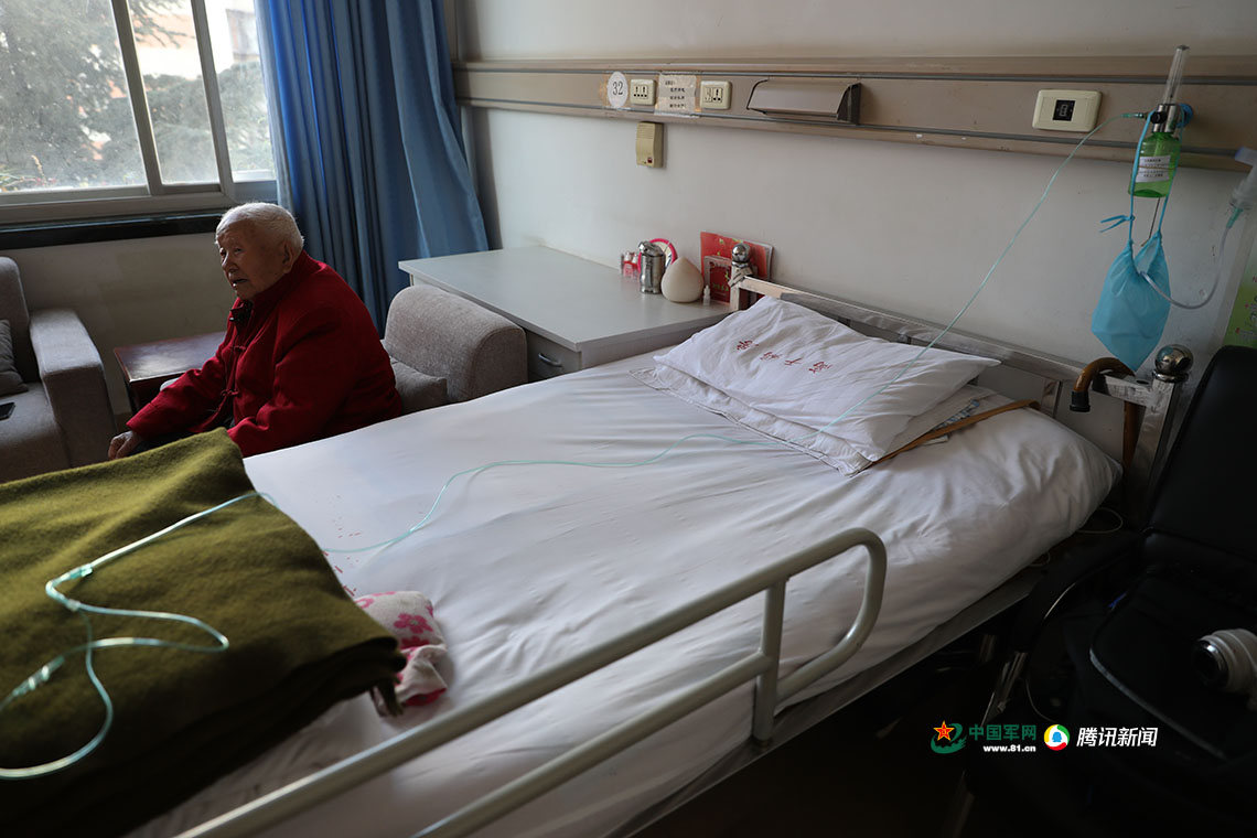 輕輕推開(kāi)病房的門,映入記者眼簾的是一間簡(jiǎn)單甚至有些破舊的病房。微微泛黃的裝修,衛(wèi)生間的門吱吱作響。李登才的起居也簡(jiǎn)簡(jiǎn)單單,一個(gè)放著《解放軍報(bào)》的報(bào)紙架、兩只沙發(fā)、一臺(tái)電視、一張床、一張桌,這就是病房的所有家具。桌子上還有老人吃剩的一些午飯和半顆雞蛋。按照相關(guān)政策標(biāo)準(zhǔn),李登才可以住進(jìn)更好的病房,但是他說(shuō),“時(shí)間長(zhǎng)了,住慣了,這里挺好的。”