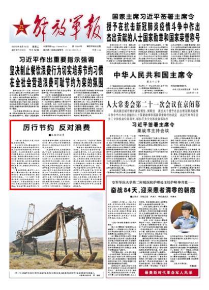 “歷覽前賢國與家,成由勤儉敗由奢?!绷?xí)主席一直高度重視糧食安全和提倡“厲行節(jié)約、反對(duì)浪費(fèi)”的社會(huì)風(fēng)尚,多次強(qiáng)調(diào)要制止餐飲浪費(fèi)行為。2013年1月,習(xí)主席就作出重要指示,要求厲行節(jié)約、反對(duì)浪費(fèi)。此后,習(xí)主席又多次作出重要指示,要求以剛性的制度約束、嚴(yán)格的制度執(zhí)行、強(qiáng)有力的監(jiān)督檢查、嚴(yán)厲的懲戒機(jī)制,切實(shí)遏制公款消費(fèi)中的各種違規(guī)違紀(jì)違法現(xiàn)象,并專門對(duì)培養(yǎng)學(xué)生勤儉節(jié)約良好美德等提出明確要求。我軍堅(jiān)決貫徹落實(shí)習(xí)主席一系列重要指示精神,堅(jiān)決貫徹落實(shí)中央八項(xiàng)規(guī)定和軍委十項(xiàng)規(guī)定精神及其實(shí)施細(xì)則,大力正作風(fēng)、糾“四風(fēng)”,厲行節(jié)約、反對(duì)浪費(fèi)成為廣大官兵的一種價(jià)值取向、一種精神狀態(tài)、一種生活方式,“光盤行動(dòng)”等措施持續(xù)推進(jìn),制止餐飲浪費(fèi)工作走在前列,軍隊(duì)作風(fēng)形象贏得廣泛贊譽(yù)。