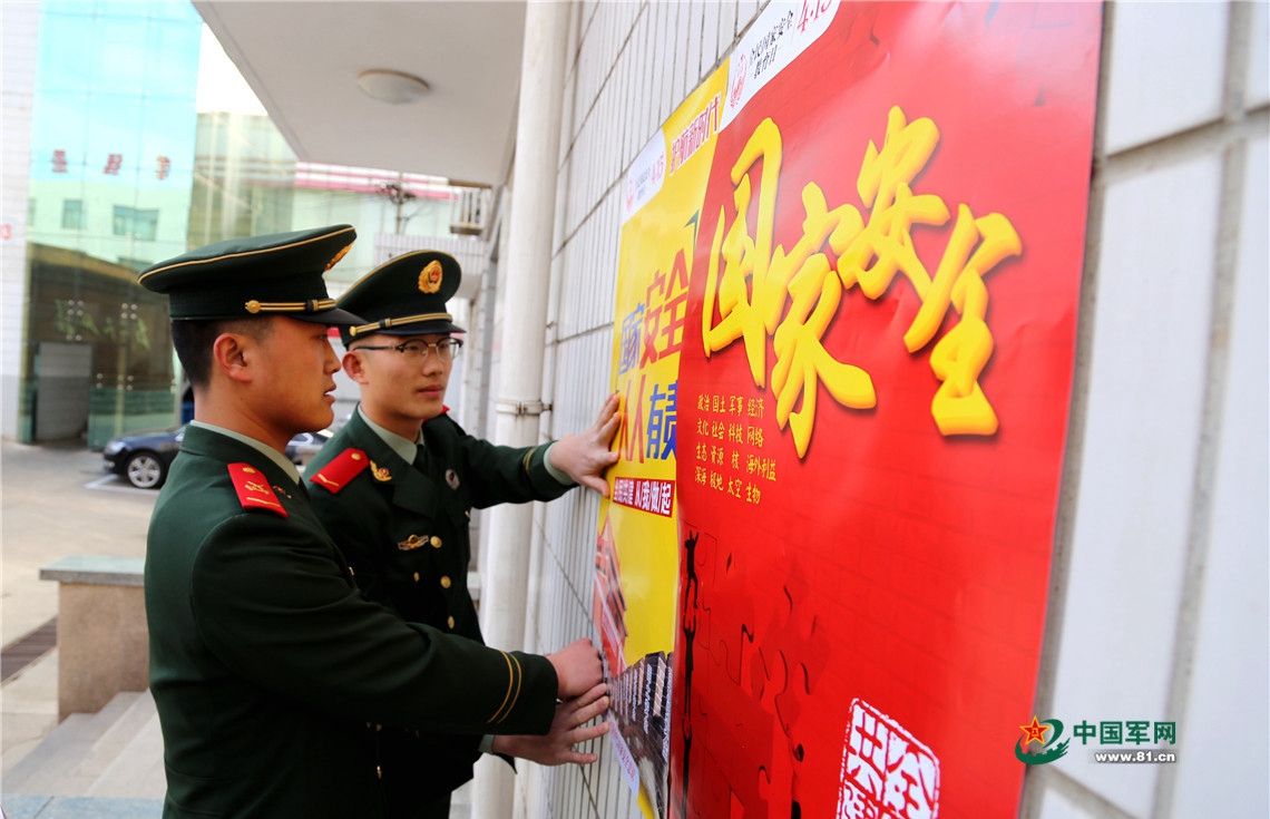 4月15日全民國家安全教育日。當(dāng)天,武警北京總隊(duì)執(zhí)勤第四支隊(duì)通過集中學(xué)習(xí)《中華人民共和國國家安全法》、發(fā)放宣傳冊、張貼宣傳海報等方式,引導(dǎo)官兵認(rèn)清國家安全形勢,增強(qiáng)危機(jī)憂患意識,樹立國家安全觀念。圖為官兵張貼宣傳海報。姜潤邈 攝