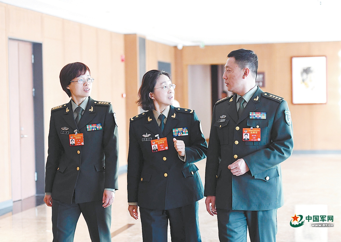 3月5日下午,軍隊政協(xié)委員尹璐、李賢玉、徐忠富(從左至右)在參加小組會議間隙討論交流。