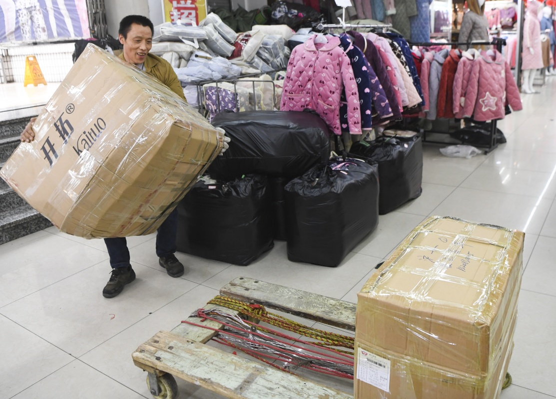 1月5日,冉光輝在重慶朝天門大正商場內(nèi)裝載貨物。新華社記者 王全超 攝