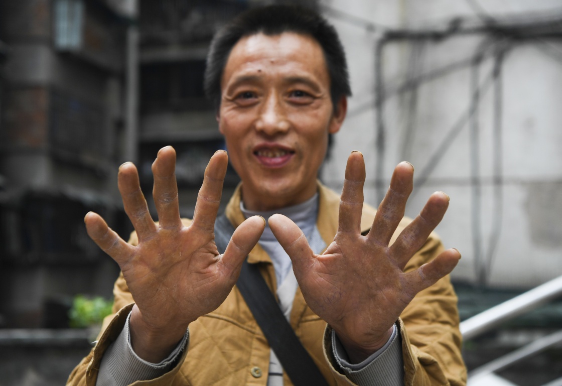 1月5日,冉光輝展示自己的雙手。由于長期搬運重物,他的手磨出了不少老繭。新華社記者 王全超 攝