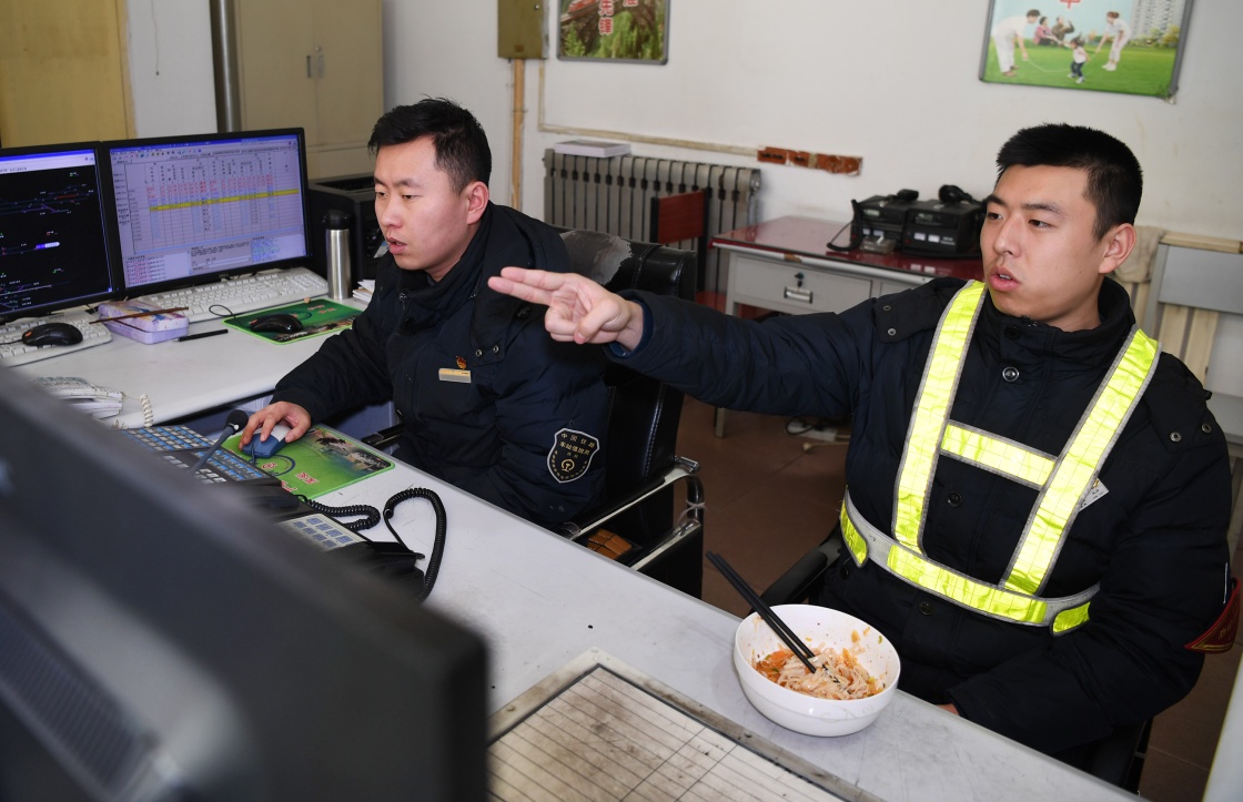 1月7日,青石崖車站助理值班員趙帥(右)一邊吃飯,一邊確認(rèn)列車進(jìn)路。新華社記者陶明攝