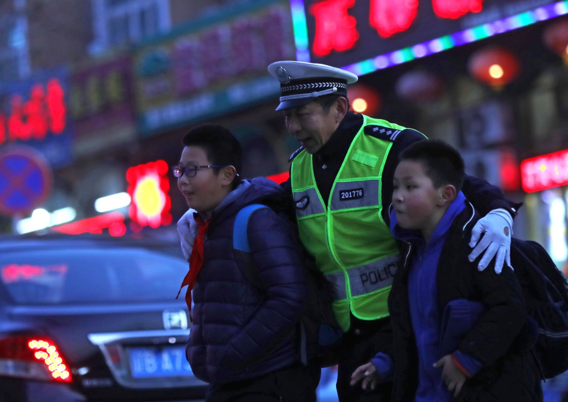 1月2日,楊傳峻在大連市旅順口區(qū)迎春小學(xué)門口護(hù)送學(xué)生放學(xué)。新華社記者 楊青 攝
