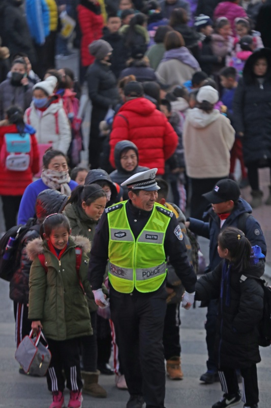 1月2日,楊傳峻在大連市旅順口區(qū)迎春小學(xué)門口護(hù)送學(xué)生放學(xué)。新華社記者 楊青 攝