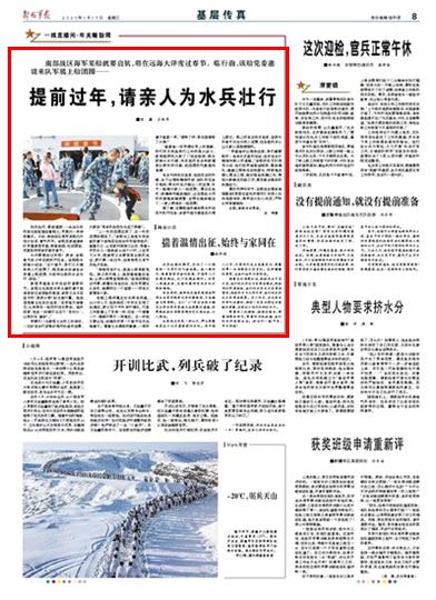揣著這份溫情出征,縱使走出千里萬里,我們的水兵也不會(huì)感到遙遠(yuǎn);縱使闖過驚濤駭浪,我們的水兵也不會(huì)感到害怕;縱使終日與大洋為伴,我們的水兵也不會(huì)感到寂寞。多少年后,當(dāng)這些水兵回憶往事時(shí),相信一定會(huì)記得這次特殊的團(tuán)圓,還有這個(gè)陽光燦爛的日子。