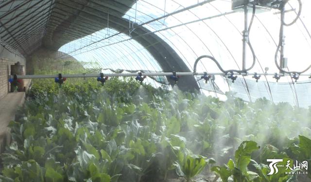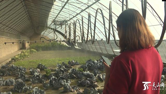村民約日古麗·阿布杜卡德?tīng)柪檬謾C(jī)對(duì)蔬菜進(jìn)行遠(yuǎn)程噴灑。