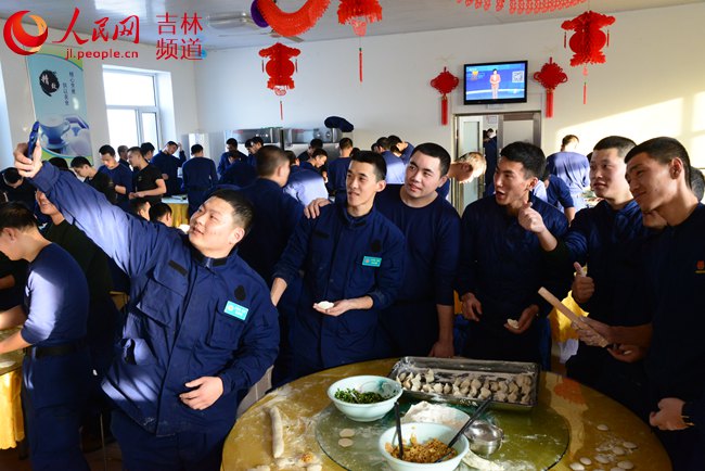 吉林省森林消防總隊新訓(xùn)大隊的新隊員包餃子慶祝小年。李洋 攝