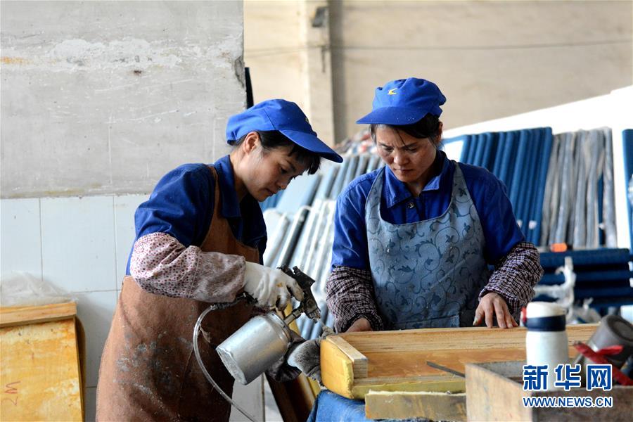 梁桂枝(左)在車間幫助姐姐梁桂蘭修補座墊(2019年12月10日攝)。新華社發(fā)(孫赟飛攝)