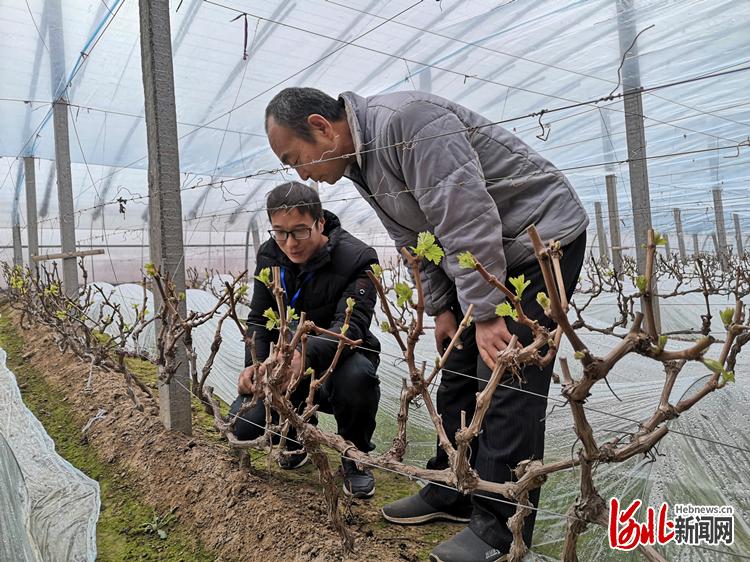 “別著急,一會兒就到!”趙見行嘴里塞著半拉饅頭,邊穿棉襖邊不停地答應(yīng)著。約半小時后,趙見行已經(jīng)鉆進了饒陽鎮(zhèn)北關(guān)村葡萄種植戶王占嶺的葡萄棚。