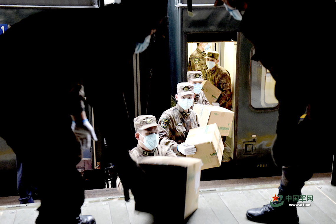 1月26日上午,全軍首批從遼寧沈陽、山東菏澤緊急調(diào)撥衛(wèi)生物資抵達(dá)武漢,軍隊(duì)前方指揮協(xié)調(diào)組協(xié)調(diào)軍地雙方進(jìn)行物資交接。圖為官兵在漢口火車站迅速搬運(yùn)物資。解放軍報(bào)記者范顯海 攝