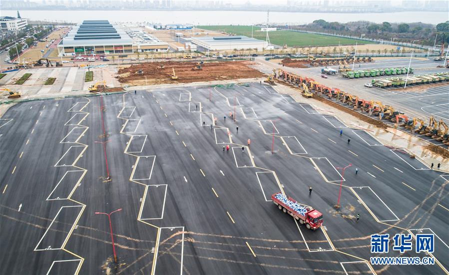 1月26日,在武漢雷神山醫(yī)院建設(shè)工地,大型機械加緊施工(無人機照片)。新華社記者 肖藝九 攝