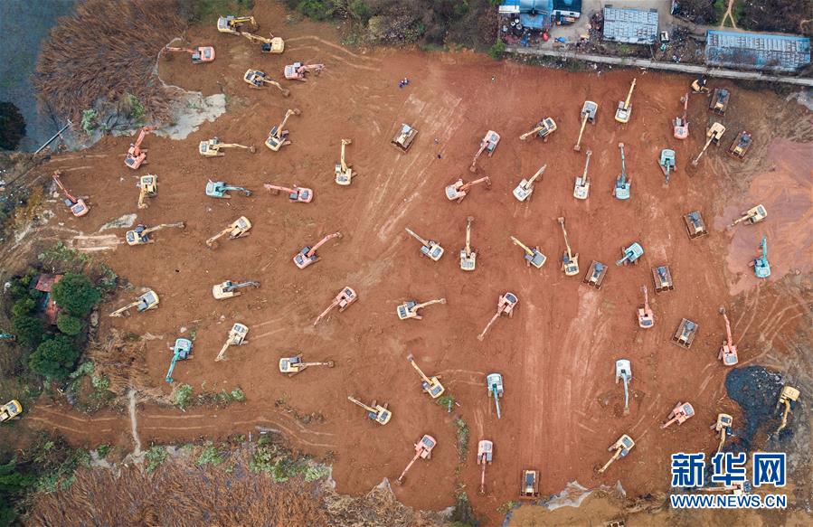 1月24日,在武漢蔡甸火神山醫(yī)院建設(shè)工地,大型機械加緊施工(無人機照片。新華社記者 肖藝九 攝