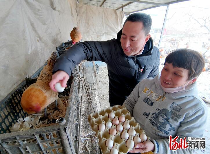 國(guó)網(wǎng)饒陽縣供電公司駐豆村第一書記劉月倫(左)幫農(nóng)戶收雞蛋。 河北日?qǐng)?bào)記者焦磊 攝