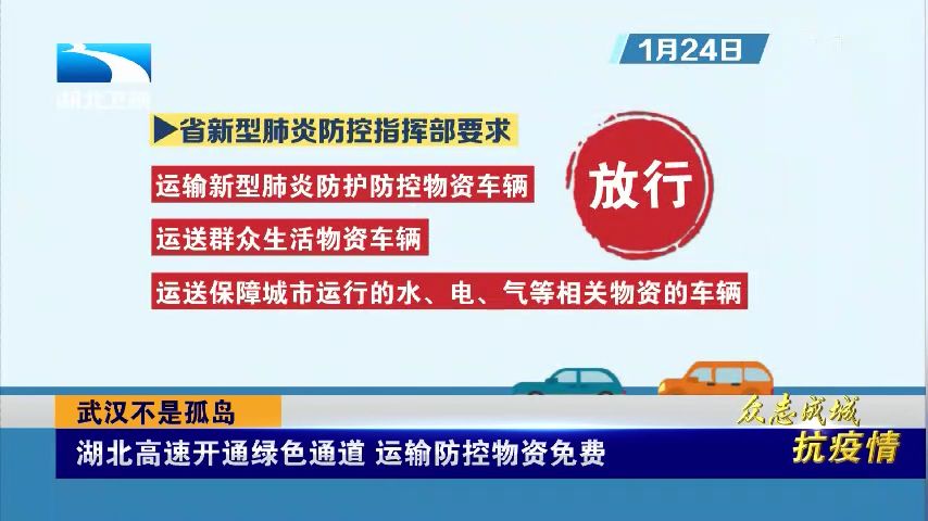 目前進出武漢的40多個高速公路收費站實施了交通管制,如何保障運輸防控物資的車輛能夠順利進入武漢成為大家關(guān)心的問題。24號,省交通運輸廳下發(fā)通知,根據(jù)省新型肺炎防控指揮部要求,即日起,對運輸新型肺炎防護防控物資車輛、運送群眾生活物資車輛以及運送保障城市運行的水、電、氣等相關(guān)物資的車輛予以放行,其中,運輸新型肺炎防護防控物資車輛通行湖北高速公路一律免費。