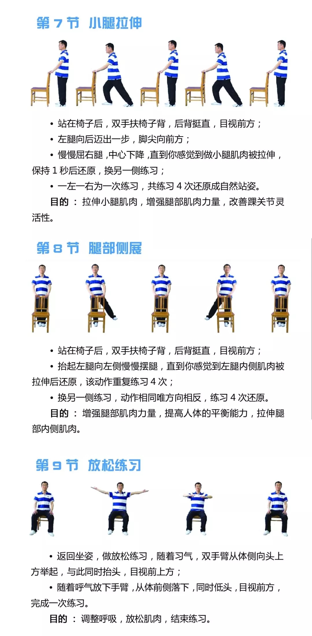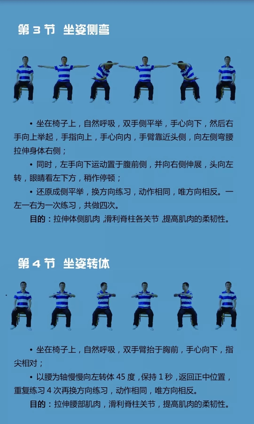 練習(xí)時,起始動作要求端正地坐在椅子上,自然呼吸,目視前方,雙手臂下垂,雙腳平行,腳尖指向正前方,各節(jié)動作都以此為開始。